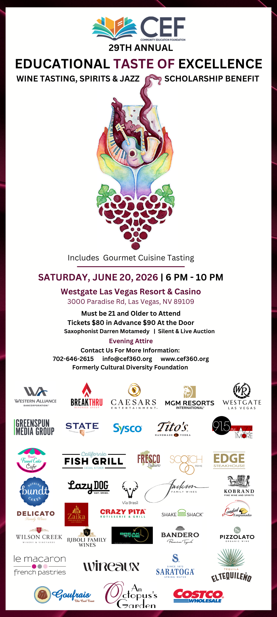 Tickets are $80.00 in advance and $90.00 at the door. Tickets will be available December 5, 2025. Call CEF at (702) 646-2615 for more info or email info@cef360.org.
